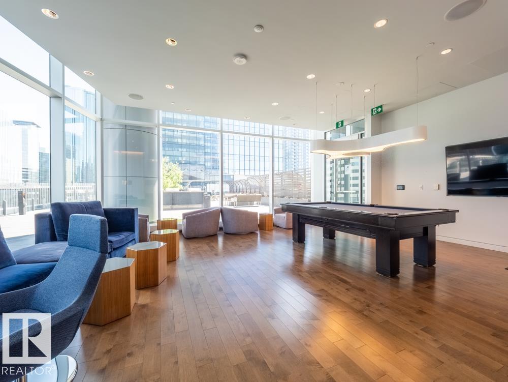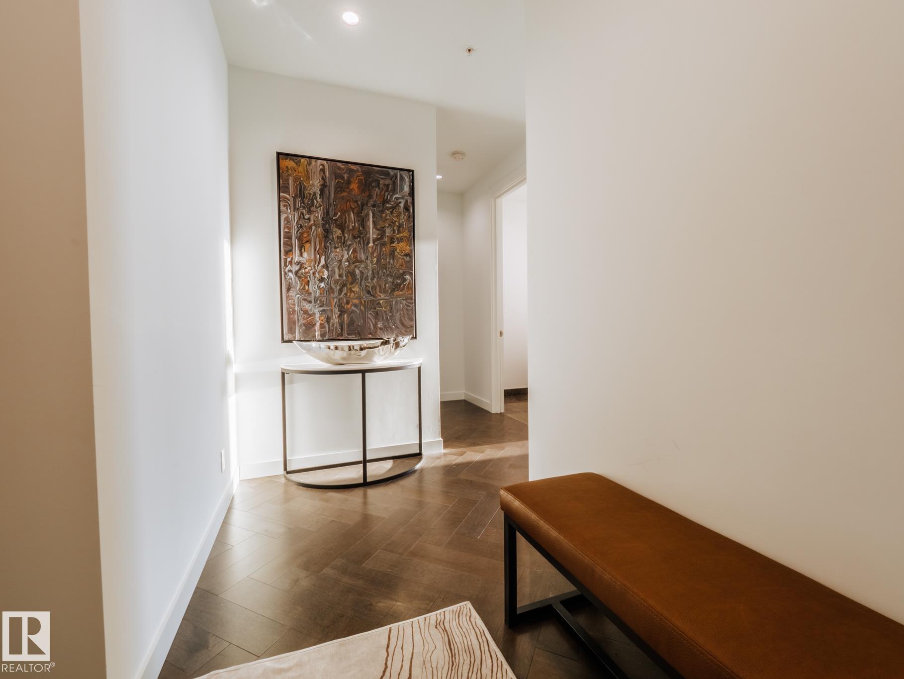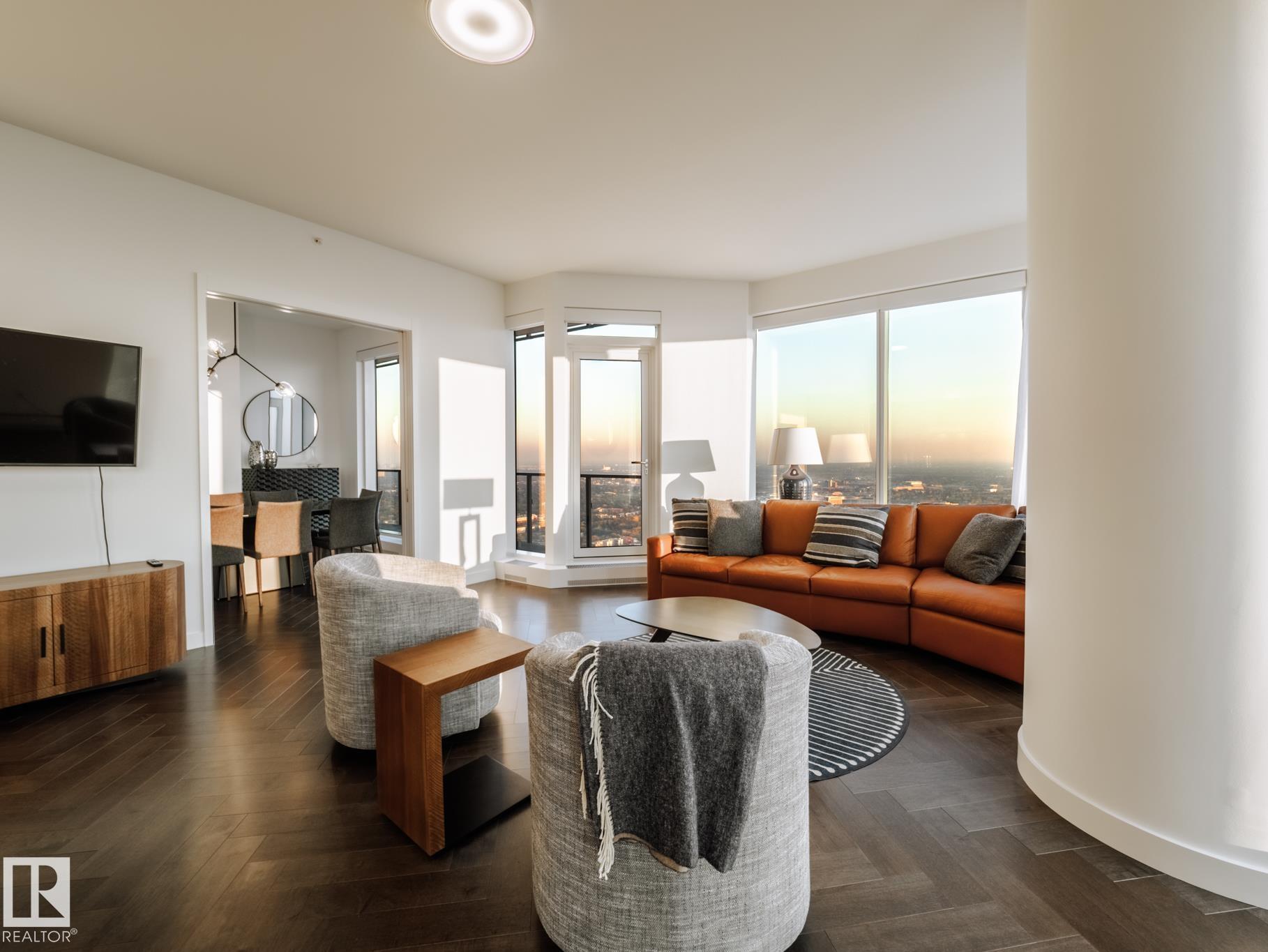EXCLUSIVE 44TH FLOOR SUITE BOASTING PREMIUM DESIGNER FINISHES....SPECTACULAR PANORAMIC VIEWS....ARCHITECTURAL PERFECTION....HERRINGBONE LAID HARDWOOD FLOORS....WHEN NOTHING BUT THE BEST WILL DO...~!WELCOME HOME!~ First steps into your new LIFESTYLE; perfect foyer leads towards the HEART of the condo. Spectacular kitchen, high end appliances w/ built in wine fridge, and a warm modern flavour. CURTAIN WALL GLASS is everywhere * custom powered window treatments lets you decide on the birds eye city view or opulence exuding inside the unit! The living space falls nothing short of spectacular. The north wing has a dining room w/ views for days. Den/flex room on east side separates the primary bedroom; and yes it has a large walk through closet and proper spa/ensuite. What could be a third bedroom is on the west side of the unit( also well appointed!) all perched on top of the ice district, JW MARRIOT, comes w/ concierge, access to pool & ARCHETYPE gym, dinning, shopping & more. Second parking stall optional*