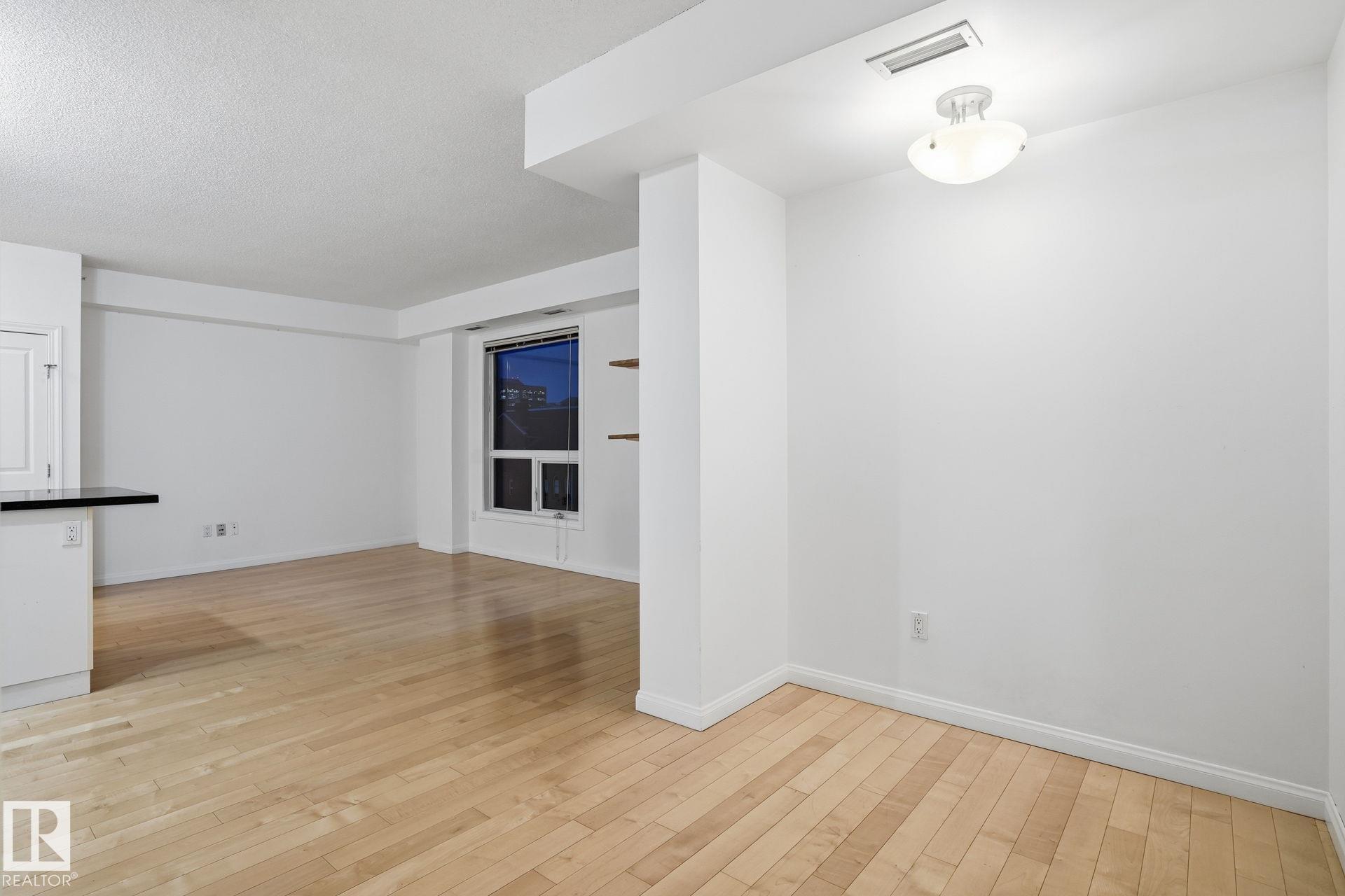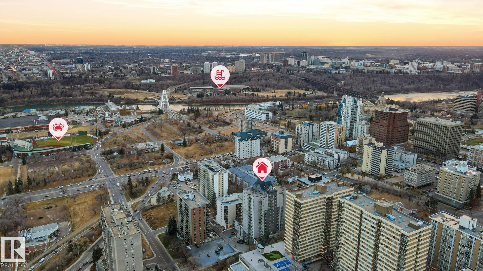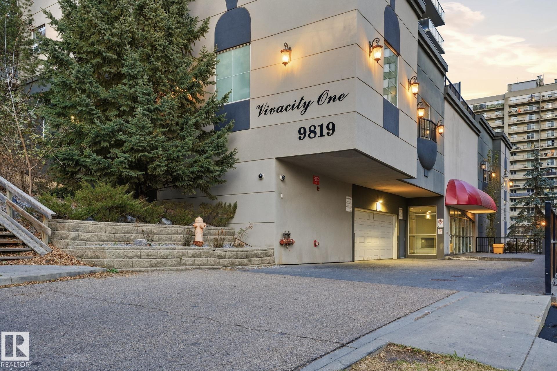 Enjoy downtown views from this move in ready condo in Vivacity, perfectly located near downtown, public transit, the river valley trails, shopping, restaurants, and the U of A. This modern open-concept suite features 9 ft ceilings, granite countertops, white cabinetry, stainless steel appliances, a kitchen island, and maple engineered hardwood flooring. The bright living area offers north and east exposures plus a gas BBQ hookup on the balcony. Recent upgrades include new carpet in the bedroom and a new furnace for added comfort. Included are the fridge, ceramic top stove, built-in microwave, dishwasher, in-suite washer & dryer, window coverings, and A/C. Comes with titled underground parking stall #96 on P1. Condo fees include heat, water, power, and access to building amenities: a rooftop patio with panoramic views, fitness room, and event room. A must-see condo offering modern living and unbeatable downtown convenience!