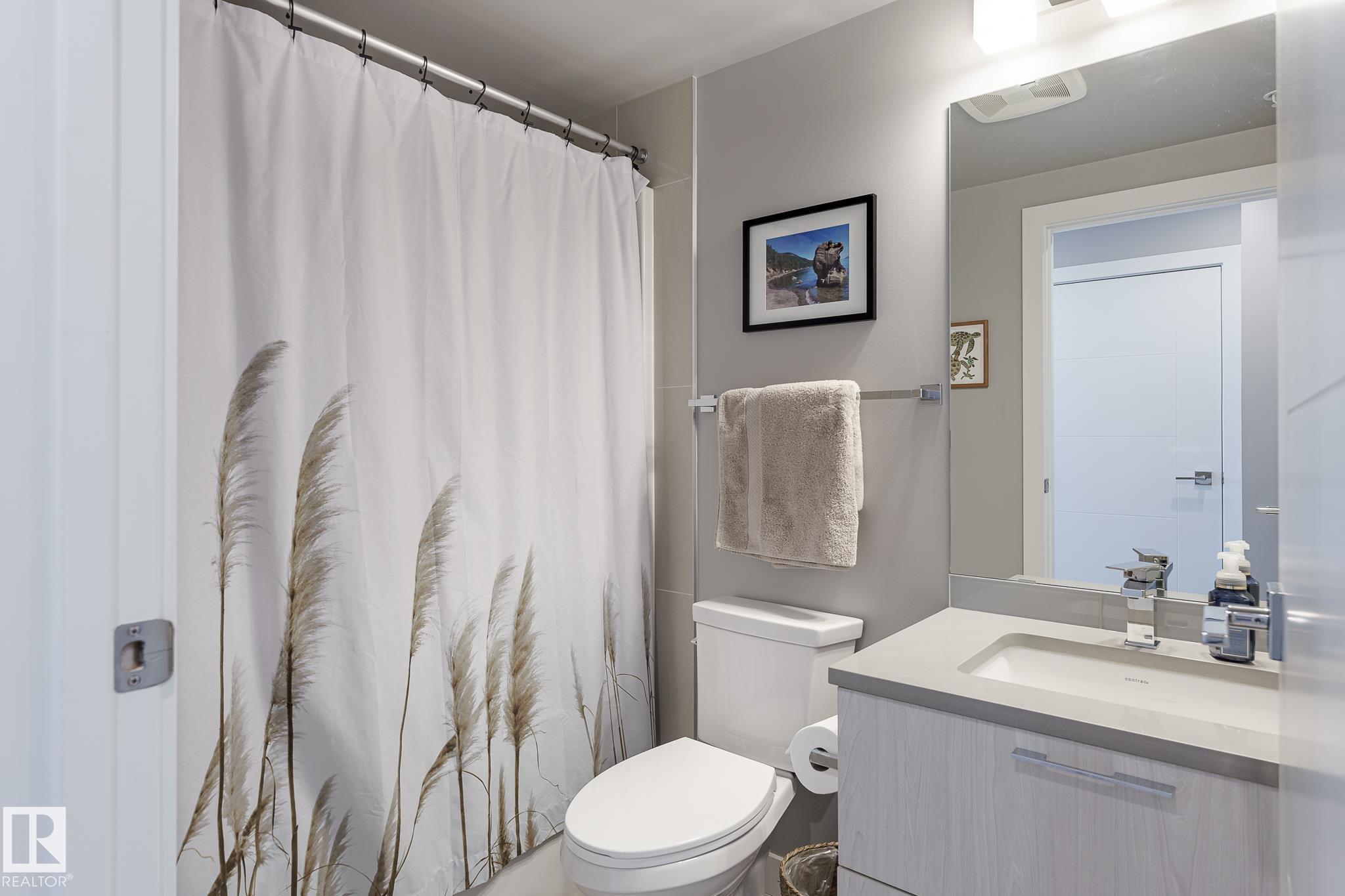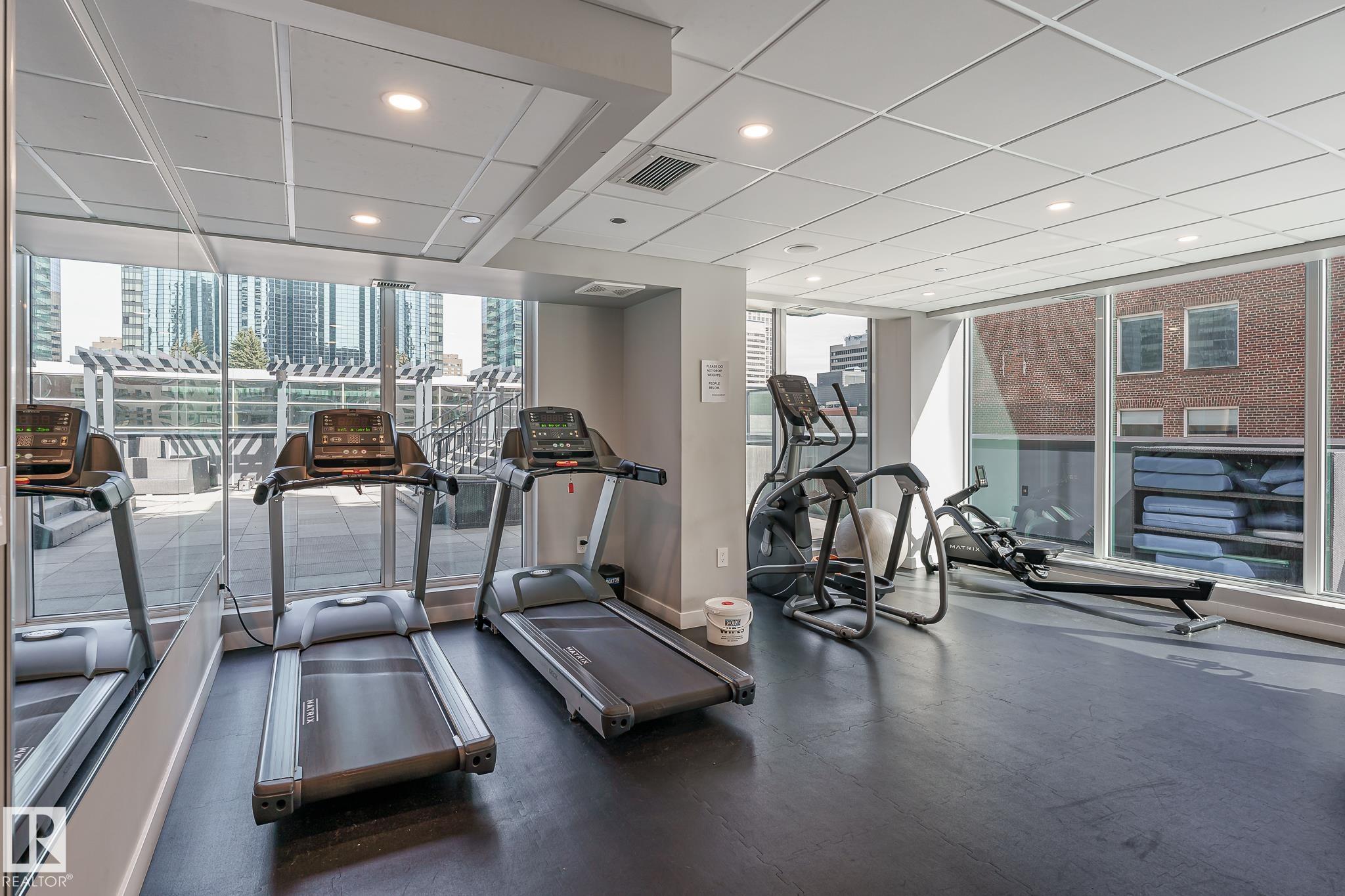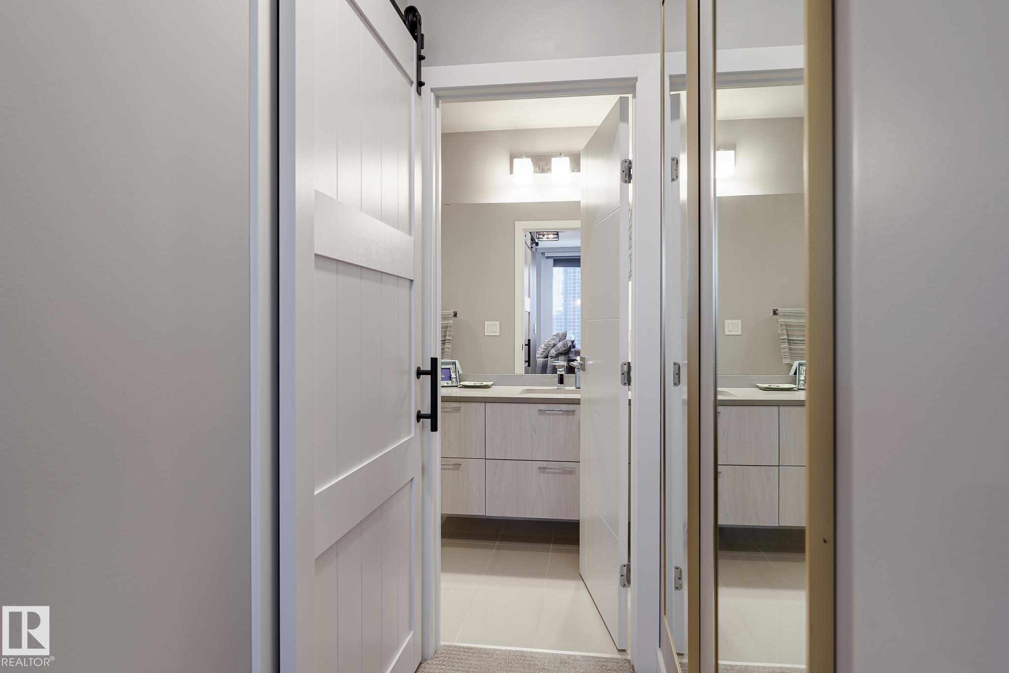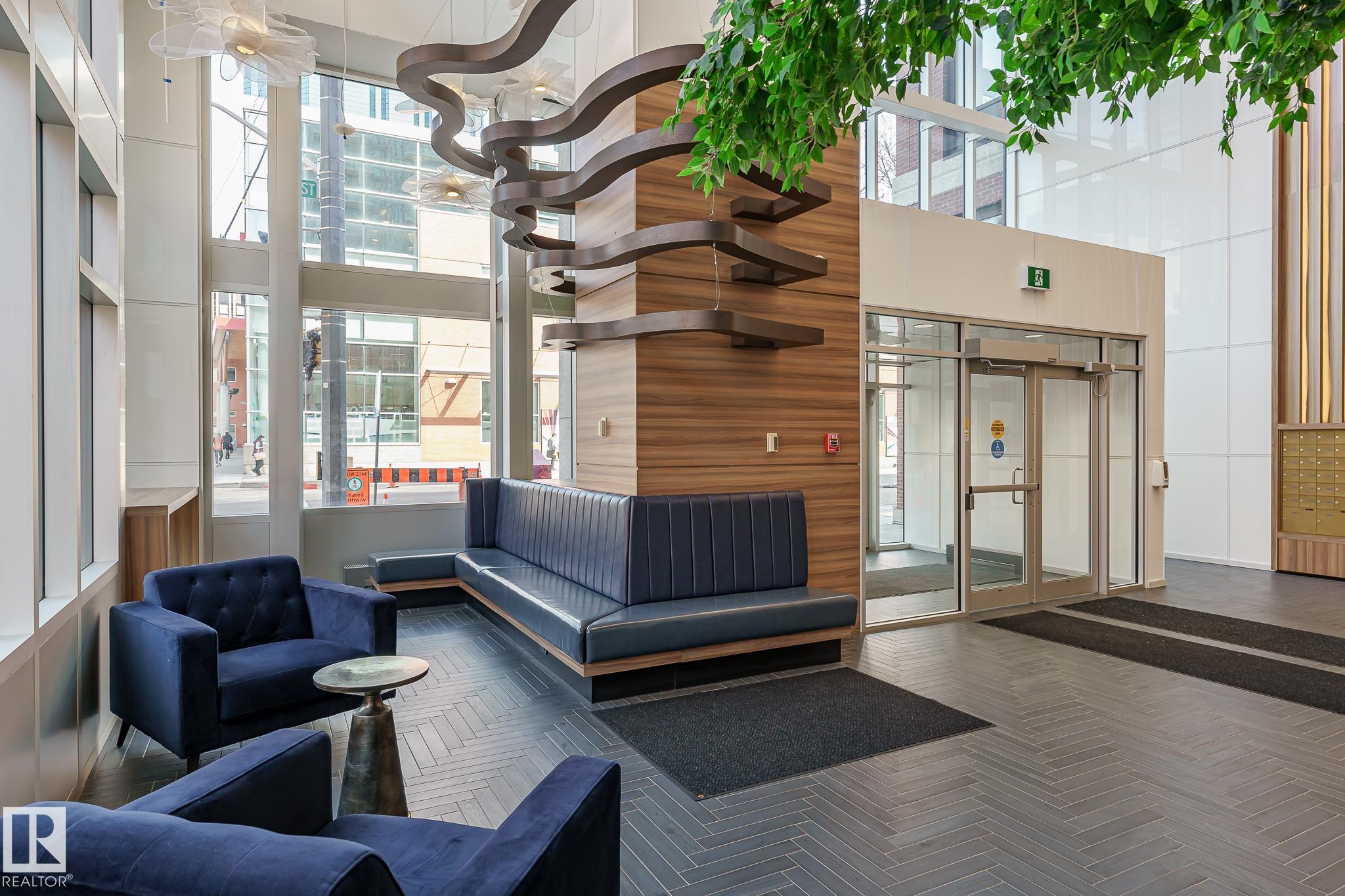 CUSTOM ONE OF A KIND UNIT IN THE WHOLE COMPLEX! Boasting the Square Footage of a Two Bedroom this One Bedroom / Two Bath unit has lower condo fees, great space is in mint condition. You get all the advantages of a larger unit with East, North, and South Views. Largest balcony!! Floor to ceiling windows offering unobstructed views of Rogers Place, Stantec Tower, and the River Valley. This unit features a modern light color pallet, designer kitchen with sit up bar, quartz counter tops throughout, built in appliances, spacious living room, dining area and window coverings! Encore Tower has a gorgeous 3 storey lobby w/full concierge service & an expansive amenity floor including a fitness facility & indoor/outdoor entertaining lounge. Located on the corner of 102 Ave & 103 Street, just steps from Rogers Arena, ICE District, restaurants, coffee shops. Title Parking Stall #220 is conveniently located on P2 next to the elevator (This is definitely a huge bonus). This is a Must See!