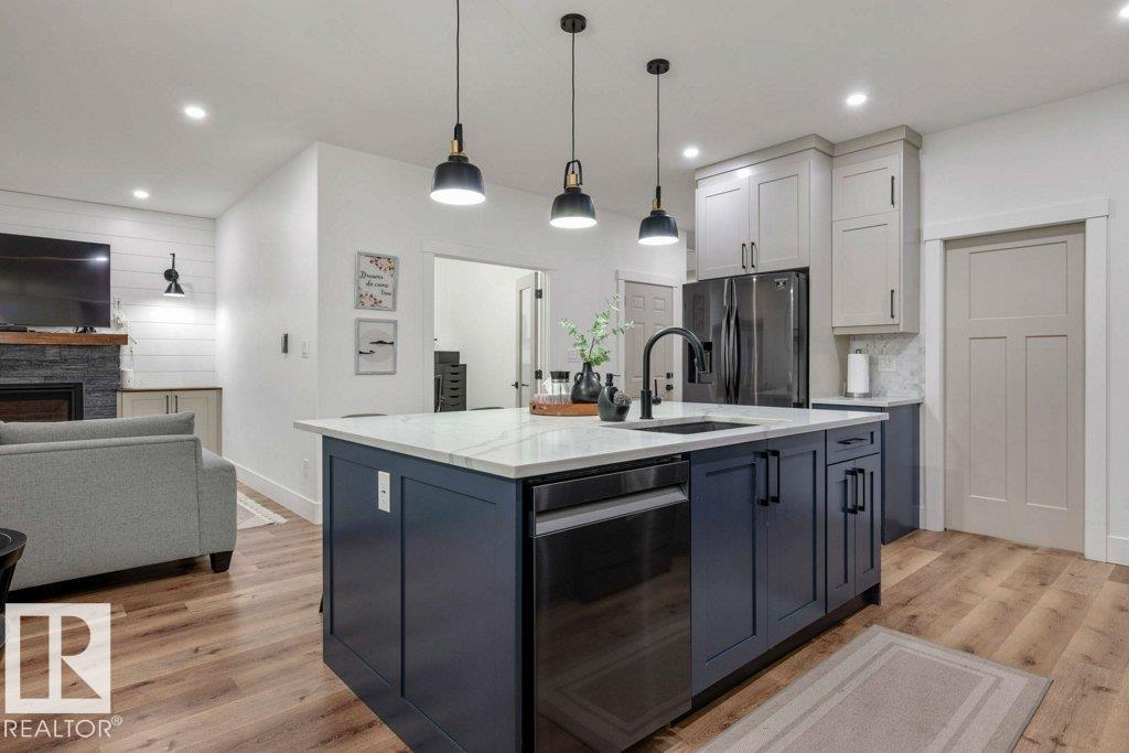 CUSTOM BUILT HOME WITH 2 BED LEGAL SUITE ACROSS FROM A POND! Step inside to a spacious entryway and elegant iron spindle staircase. Off the foyer: a stylish 2 pc bath with quartz counters, a large mudroom, access to your double attached garage, and a walkthrough pantry. The chef-inspired kitchen boasts black stainless appliances, gas range, floor-to-ceiling two-tone cabinets, and a large quartz island. The living room features a cozy stone fireplace wall—perfect for long winter nights. A main floor den adds flexible space for a home office or playroom. Upstairs offers a bright bonus room, upstairs laundry, two bedrooms, a 4 pc bath, and a stunning primary retreat with a luxurious 5 pc ensuite. The LEGAL BASEMENT SUITE has its own entrance and laundry, with two generous bedrooms, a full kitchen with quartz counters and stainless steel appliances, a 4 pc bath - A perfect mortgage helper! Quick access to all amenities, parks, paths and green space!