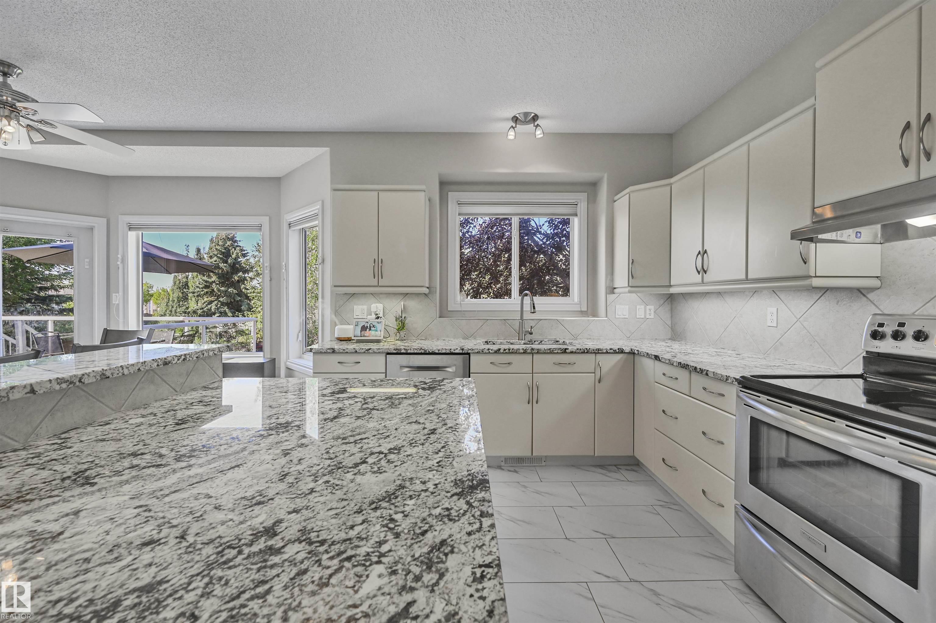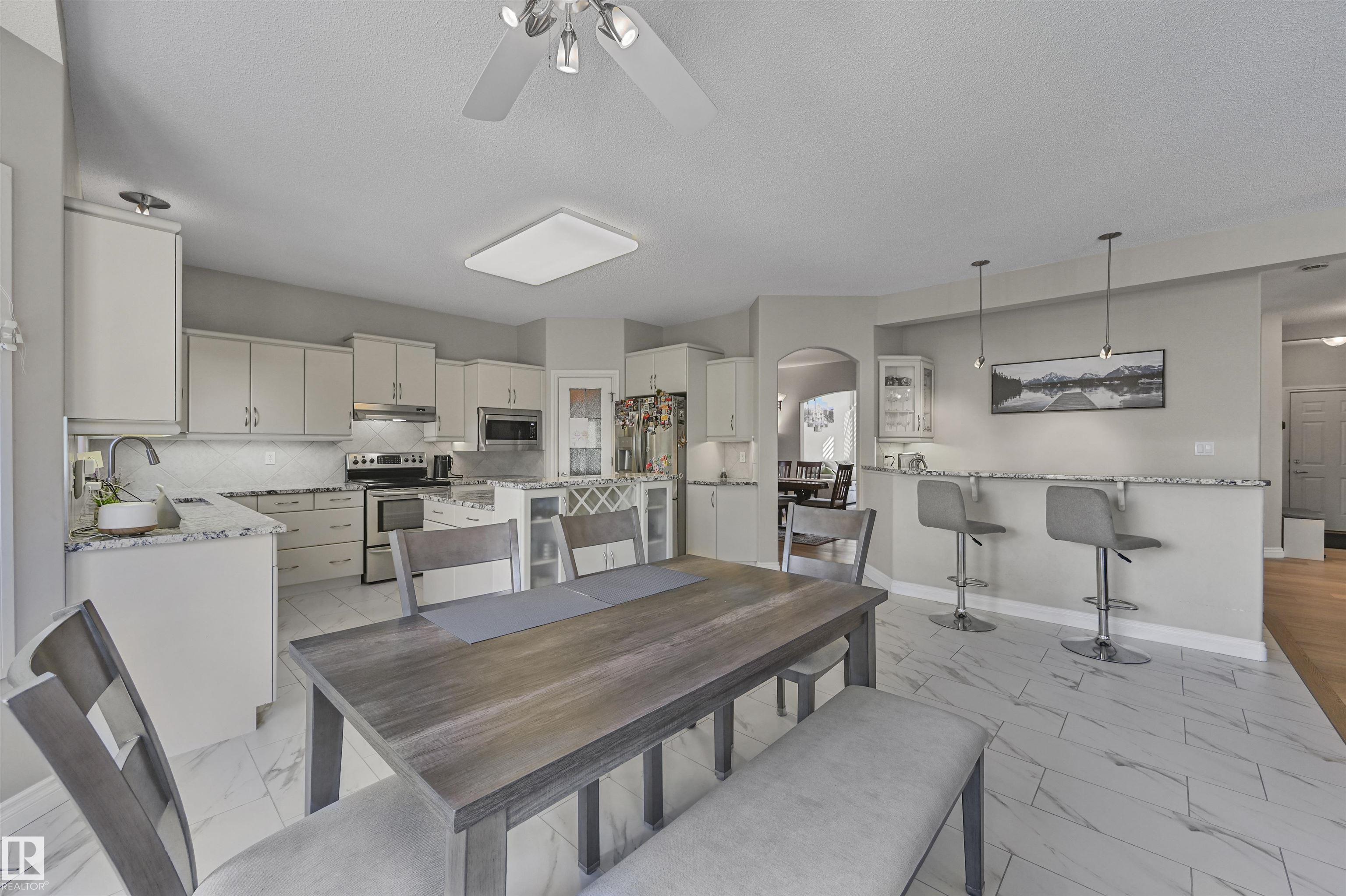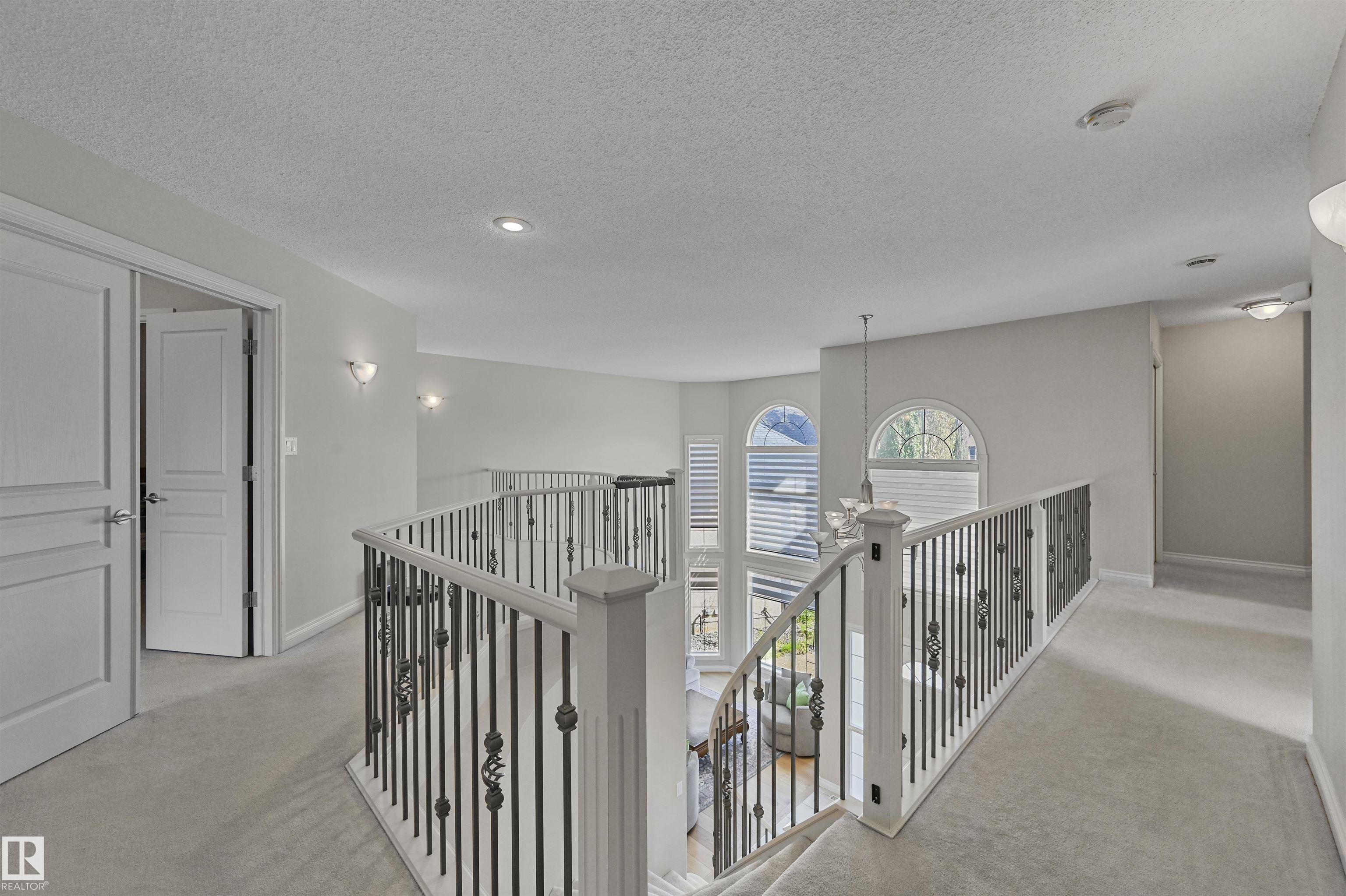 WALKOUT in Terwillegar Gardens w/ 5 BEDROOMS, built by Hillview, cul-de-sac location & close to all amenities. Open concept plan has streams of natural light through the soaring, oversized windows. Enjoy a grand entry w/curved stairs & high ceilings. Neutral contemporary color tones too. MAIN FLR BDRM/DEN w/a FULL BATHRM. Sleek bone white slab cabinets & a huge island. Newer S/S fridge & D/W. Nook opens to the family rm w/wetbar & a massive upper deck w/glass railings. Formal dining & living rm. Upstairs has FIVE LARGE BDRMS. Primary suite boasts a beautiful ensuite, fireplace & W/I closet. F/Fin WALKOUT bsmt includes a Games area, rec rm w/ fireplace & full bthrm. 2 addtl rooms can be completed for a bedrm & exercise area. Massive 8900sf SW pie yard w/mature trees for privacy. Plus huge upper deck. Oversized double garage 22X26. Upgrades: AC (2024), NEW engineered hardwood & tile, NEW granite & quartz counters, 2024 Bathroom updates, new washer/dryer, irrigation system, some blinds updated & more!