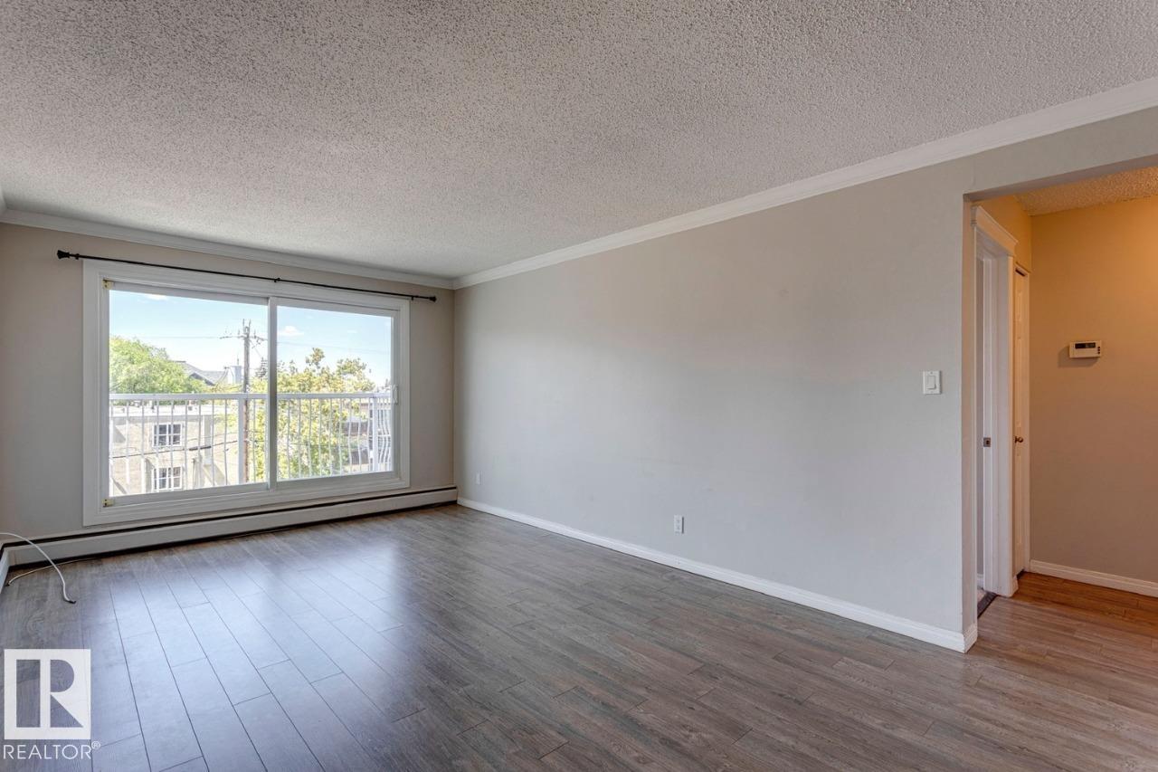 This bright top-floor corner unit is located in a three-storey walk-up building. Condo is steps from 104 Ave, with easy access to shops, parks, cafes, grocery stores, gyms, and the planned West LRT (buyer to verify). Located on a quiet, tree-lined street just minutes from downtown, the Ice District, Oliver Square, 124 Street, the Brewery District, and MacEwan University. Features include laminate flooring, carpeted bedrooms, maple cabinetry, a private balcony, large windows, in-suite storage, and an energized parking stall. The building offers secure entry with intercom. Exterior updates include siding, balconies, railings, and windows. Currently tenant occupied. Professionally managed building with reserve fund information available.