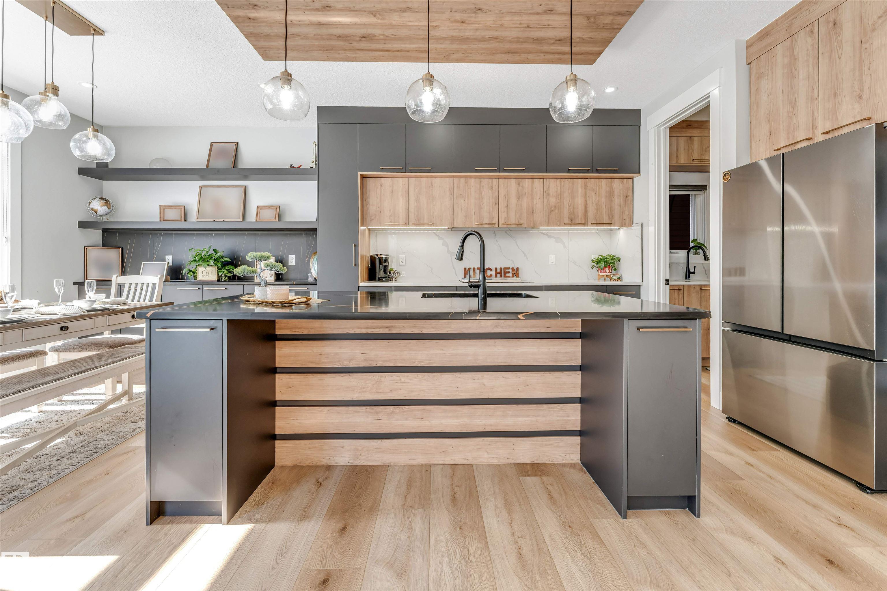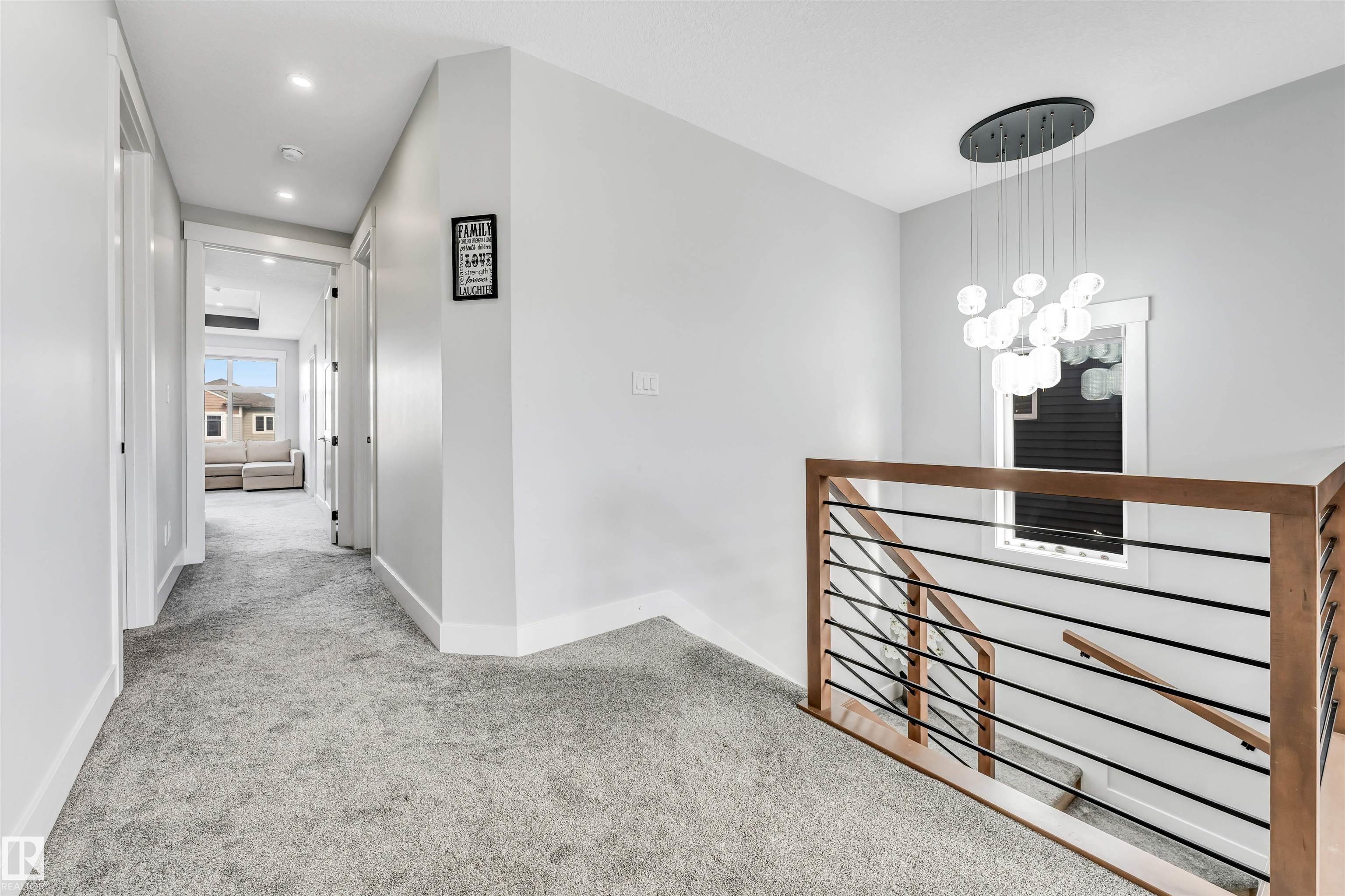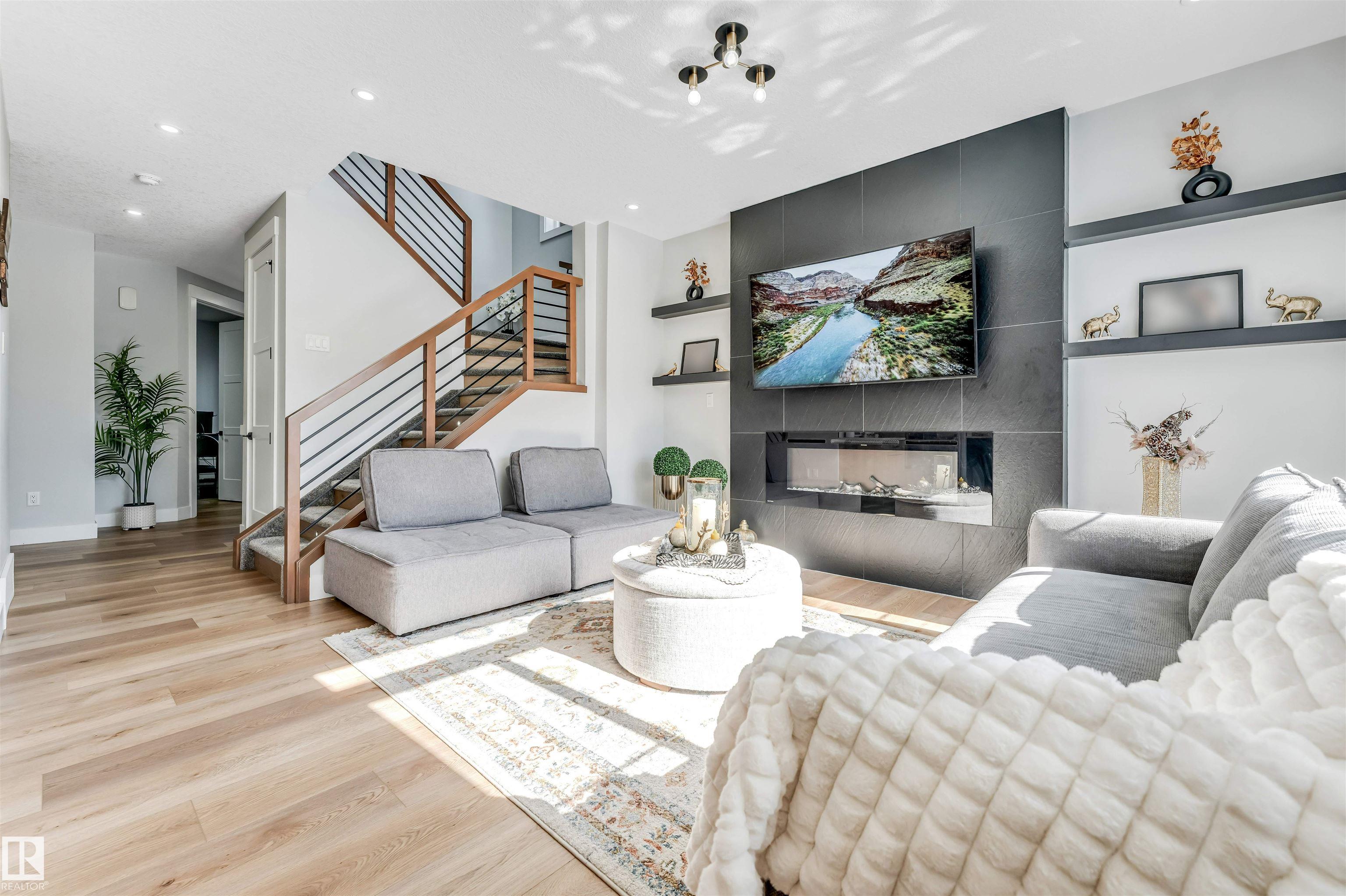 Contemporary custom-built 2-storey home approx 2,700 sq ft featuring 5 bedrooms, 4 full bathrooms, bonus room, and double tandem garage (fits 3 cars). Main floor offers a family room with fireplace, extended modern kitchen with quartz island plus SPICE KITCHEN, and a bedroom with full bath. Upstairs includes a spacious primary suite with ensuite & walk-in closet, SECOND MASTER with full bath, plus 2 more bedrooms, another full bath, laundry, and bonus room with fireplace. Highlights: separate basement entry (4 windows), 9 ft ceilings on all 3 levels, triple-pane windows, 8 ft doors, built-in speakers, feature walls, upgraded lighting & plumbing, under-cabinet & stair lighting, fully fenced NORTH-FACING 28-pocket REGULAR lot—close to all amenities.