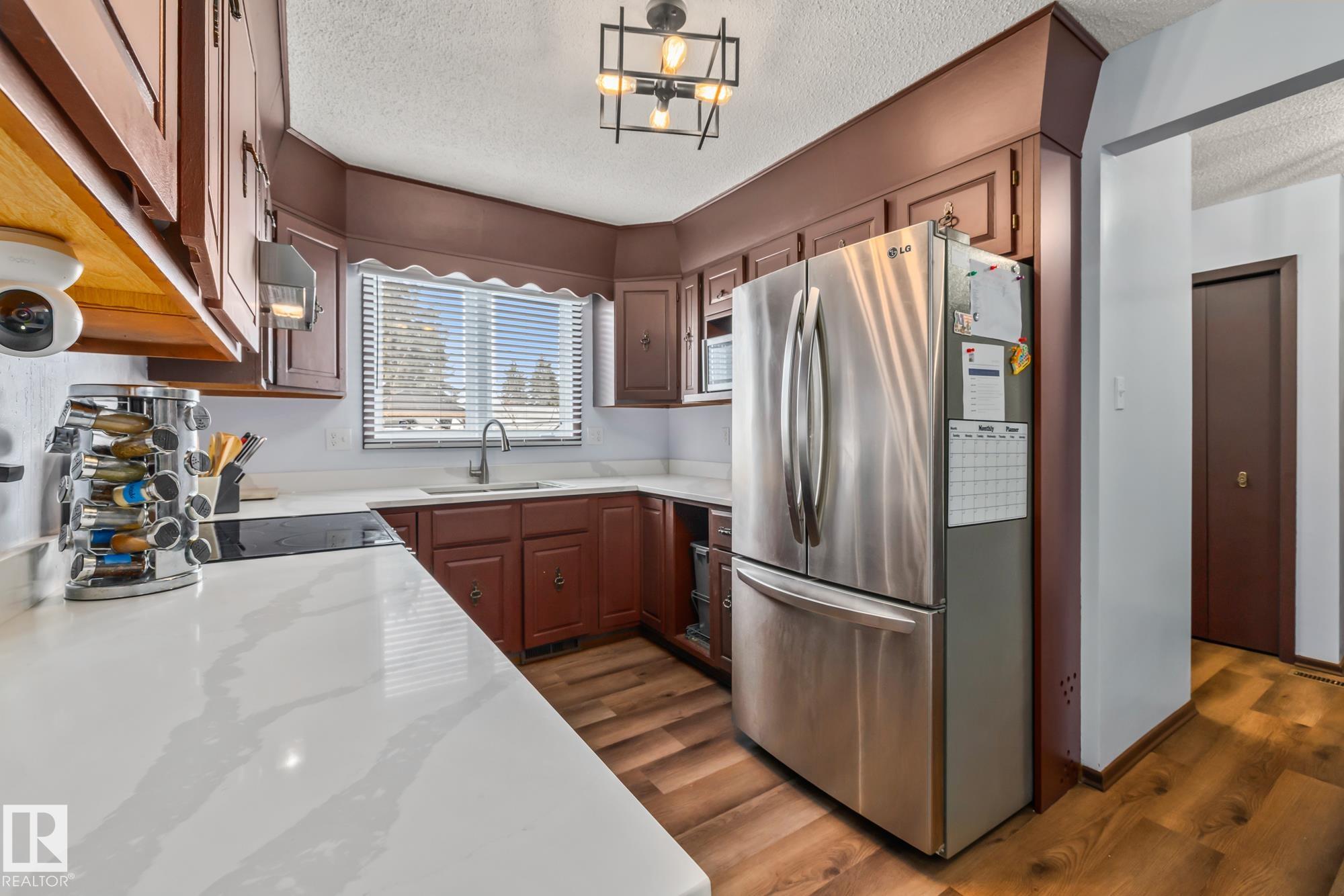 This massive 2-storey offers 9 bedrooms and 4 full bathrooms, perfect for large or multi-generational families. The upper level features 4 bedrooms including the primary with access to a private back deck. The main floor includes 3 bedrooms, 2 full baths, a bright living room with wood-burning fireplace, formal dining, spacious kitchen, and main floor laundry. The fully finished basement adds 2 bedrooms, a full bath, second family room, and rough-in for laundry with sink. Some of the most recent upgrades are shingles, paint, flooring, and HWT. Enjoy a heated oversized double garage with extra deep freezer included, plus 3 fridges total. Fully fenced yard and unbeatable location across from a park, close to schools, the Northgate street mall in 137 ave, and transit. A rare opportunity offering exceptional space and flexibility!