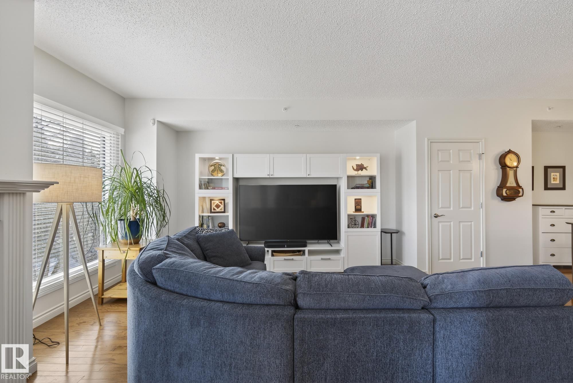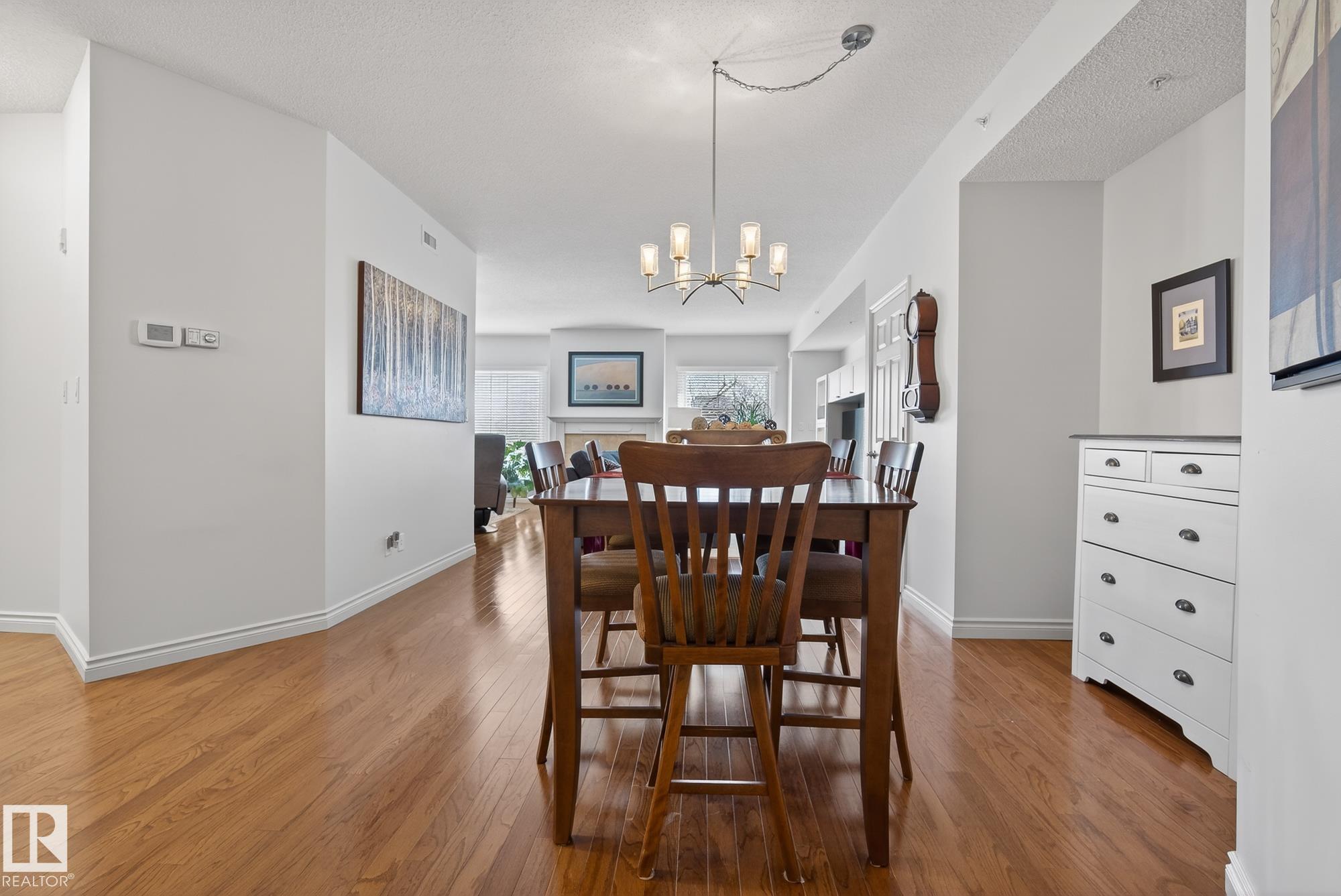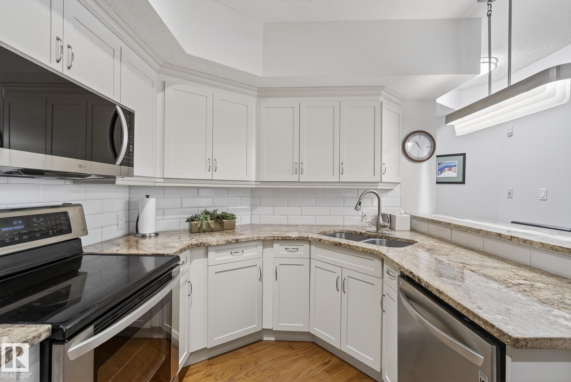 Steps from the River Valley and vibrant 124 Street, welcome to Properties on High Street—one of Edmonton’s most sought-after downtown condo buildings. This bright and spacious 1,380 sq. ft. east-facing corner unit offers 2 bedrooms and 2 bathrooms with beautiful views of tree-lined streets and the downtown skyline. Large windows fill the home with natural light, complementing the 9 ft. ceilings, hardwood and tile flooring, and cozy gas fireplace. The beautifully finished kitchen features granite countertops, classic white shaker cabinetry, and eat-up bar. The generous primary suite includes a spacious ensuite, while the second bedroom is ideal for guests or a home office. Enjoy central air conditioning and relaxing or entertaining on the private covered balcony with gas BBQ hookup. This well-managed, pet-friendly building offers an exercise room, courtyard patio, onsite caretaker, and heated underground parking. A rare opportunity to enjoy spacious downtown living in a premier location.